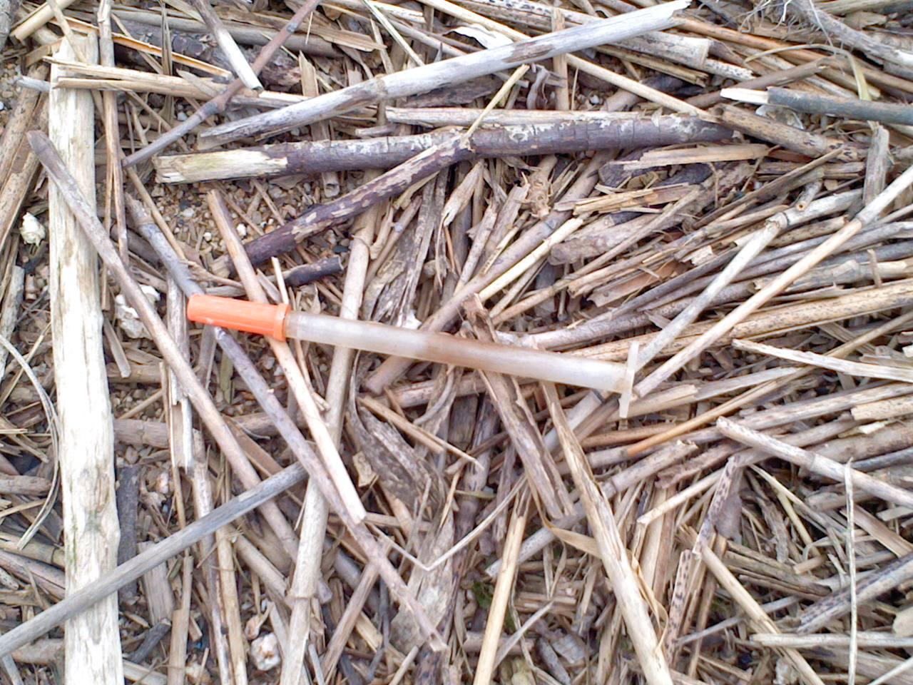 写真は調査地点とゴミの様子。ほとんどの川ゴミは生活ゴミで、多くが海を汚します。私も旭川の西岸を河口から1.5キロ上流までゴミを調査しました。下写真のように注射器のようなものまでありました。